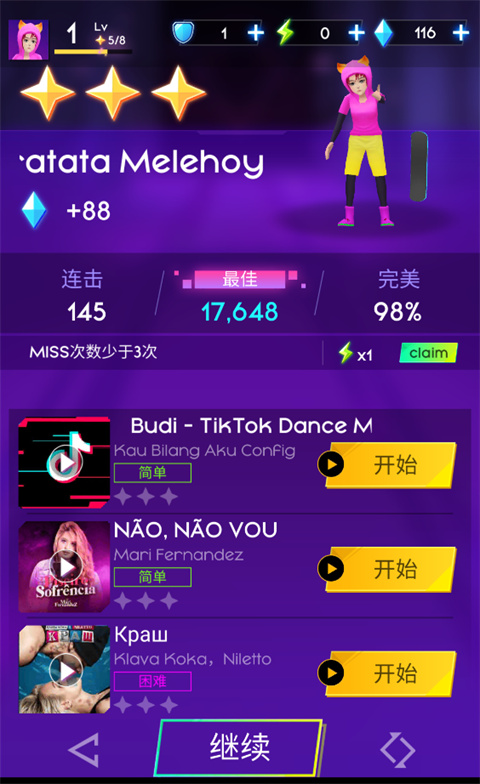 2、選擇好難度后即可選擇音樂,點(diǎn)擊開始即可開始闖關(guān);