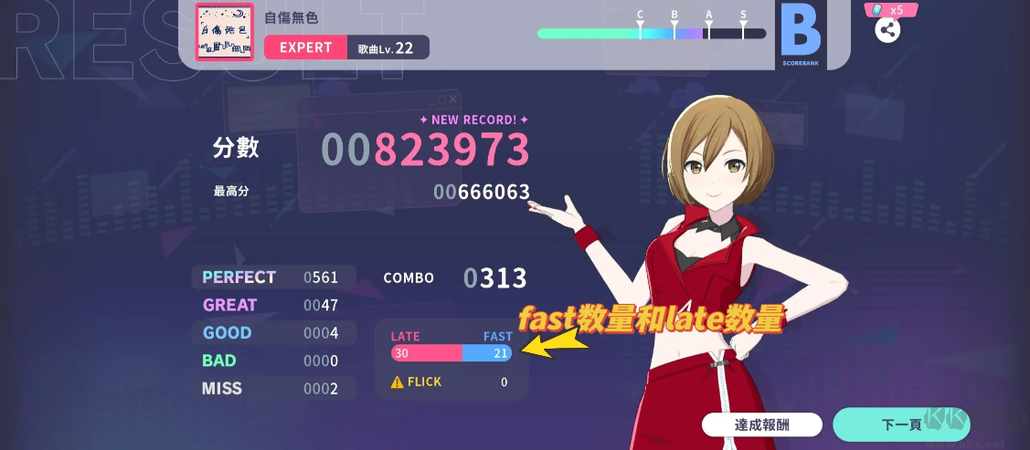 2.調(diào)整按鍵時機(jī):很主觀的一個值,不同設(shè)備(我手機(jī)和pad都不一樣)均不同,只能自己慢慢調(diào),一般就用默認(rèn)值,然后在設(shè)置里打開late/fast判定,去打歌,然后根據(jù)計分板的結(jié)果來調(diào)整,如果fast多就+這個值,如果late多就-,均衡就不用調(diào)了。